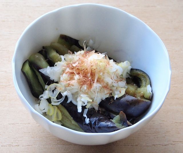 (4)ナスが冷めたらラップを外して、水気を取ってから手で割き、器に盛り付けます。(2)の調味料をかけ、(3)の刻みネギと削り節をちらします。