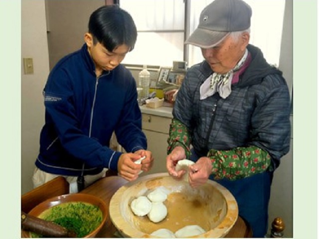 一昨年、95歳の父と90歳の母が娘と息子に団子の作り方を教えてくれました。子供達は慣れない手つきで生地をこねたり丸めたり。まさに真剣そのものでした。手の中で生まれるよもぎ団子は、本当に愛らしく味も格別!親から子、孫へと続く我が家の大切な行事食です。