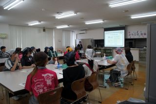 第二部では、管理栄養士より、親子を対象とした「スポーツ栄養教室」を開催しました。前半の約20分間は、補食に関する座学形式の講義を実施し、