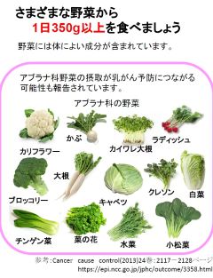 野菜を含む、食・栄養・運動に関わる乳がんの予防情報の提供、および、小児・AYA世代がんの情報の普及活動を実施した。具体的には、1日350g以上の